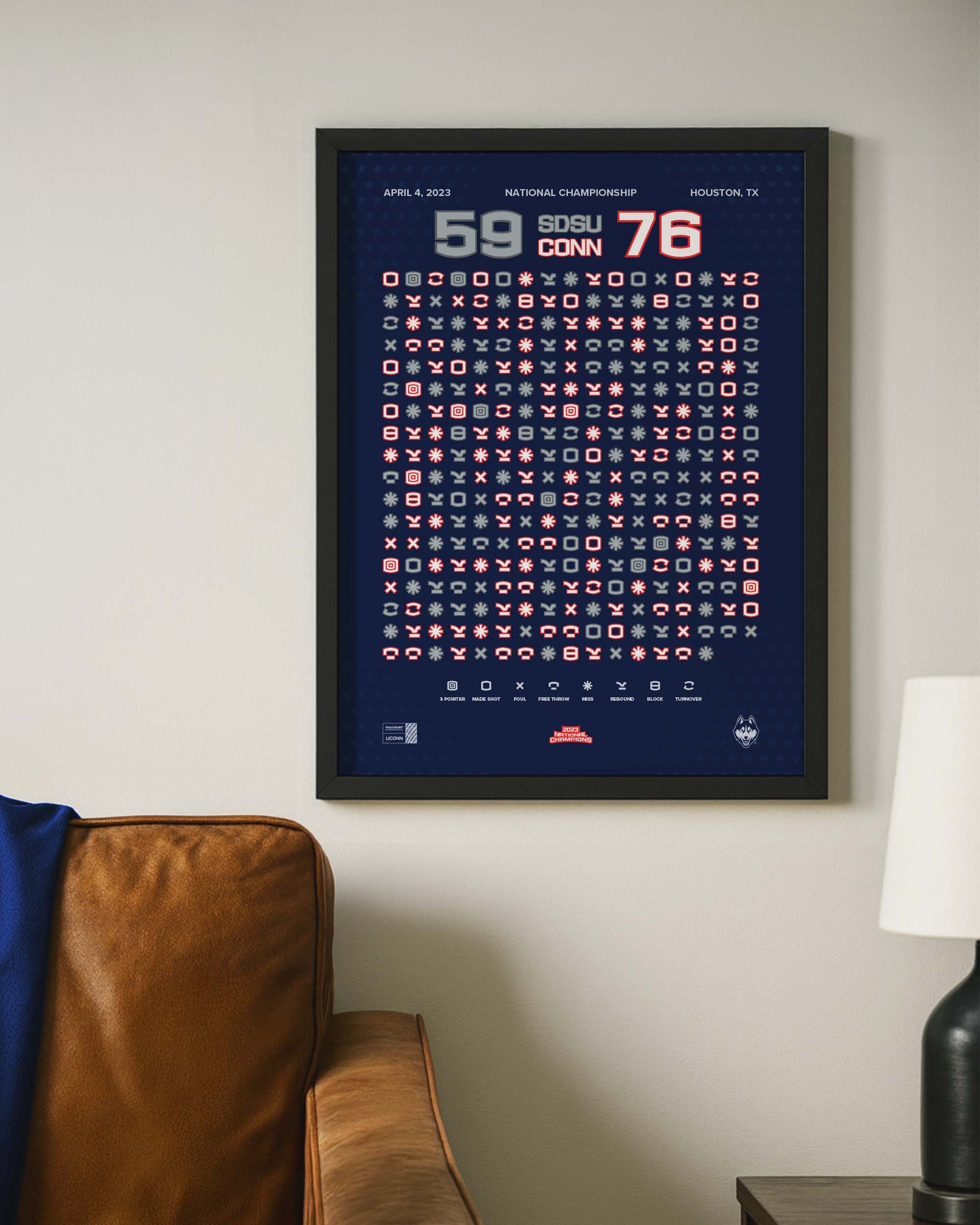 Celebrate the Huskies’ 2023 National Championship with a piece of history you can hang on your wall. Each Gameprint™ is designed from real game data — every shot, rebound, and game-changing play is captured and transformed into a one-of-a-kind art piece.